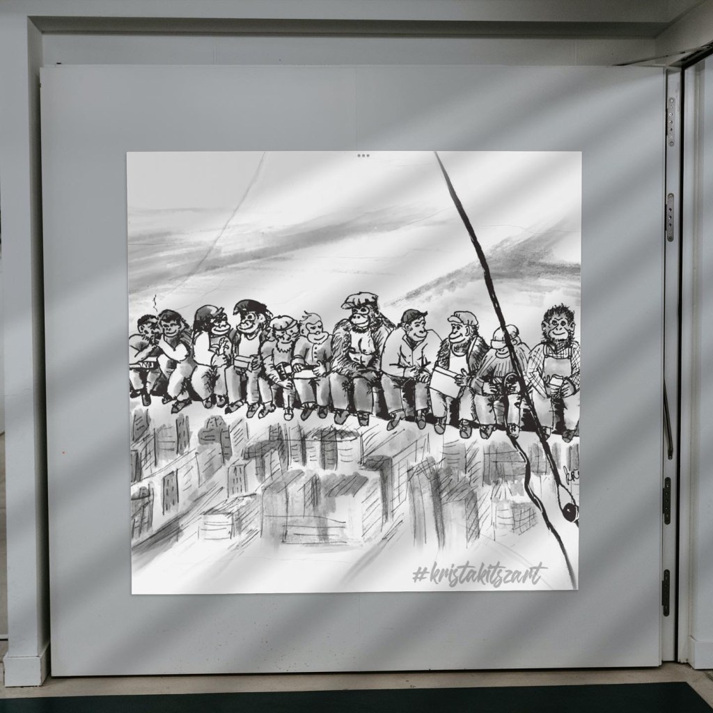 Één van mijn werken hangt er ook! Dit is mijn versie van de wereldberoemde foto “lunch atop a skyscraper” de werkers lunch boven Manhattan in de wolkenkrabber. Ik heb alle werkers getekend als aapjes, en ze allen in dezelfde positie en outfits neergezet. Dit is mijn originele parodie op deze wereldberoemde foto. Getekend met watervaste inkt pennen en grijze brush pen. “ Mnkys atop a skyscraper” door KristaKitszArt. In 2022 deed ik mee aan de online teken challenge Inktober en mijn thema voor dat jaar was apen, en deze tekening heb ik gemaakt bij weekprompt “break” (pauze).