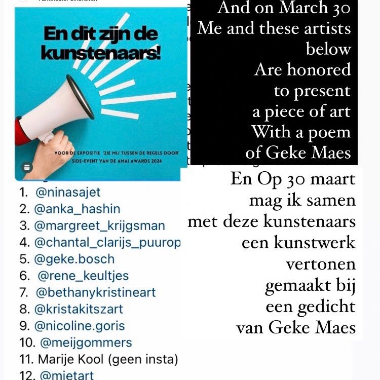 Samen met deze 15 geweldige kunstenaars mocht ik een kunstwerk maken bij een gedicht van Geke Maes uit haar bundel “Lees mij tussen de regels door” . Deze worden geëxposeerd tijdens de Amai Awards op 30 maart in Eindhoven.