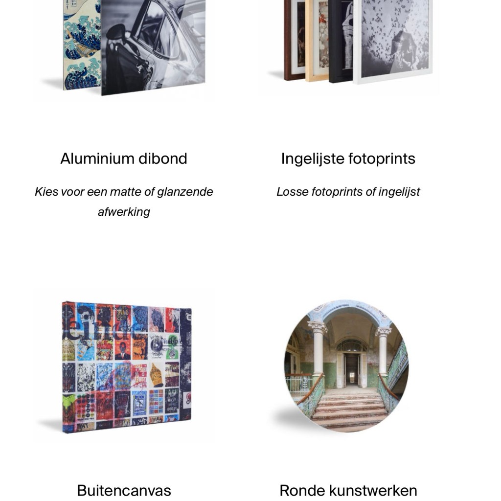 Bij Werk aan de Muur kunnen mijn werken op fine art poster prints, maar ook op vele andere materialen gedrukt worden zoals canvas, aluminium, foto behang, buiten canvas, foto prints, hd metal, acrylic glass en ronde prints, inclusief ophangsystemen. Zie onderstaande foto’s.