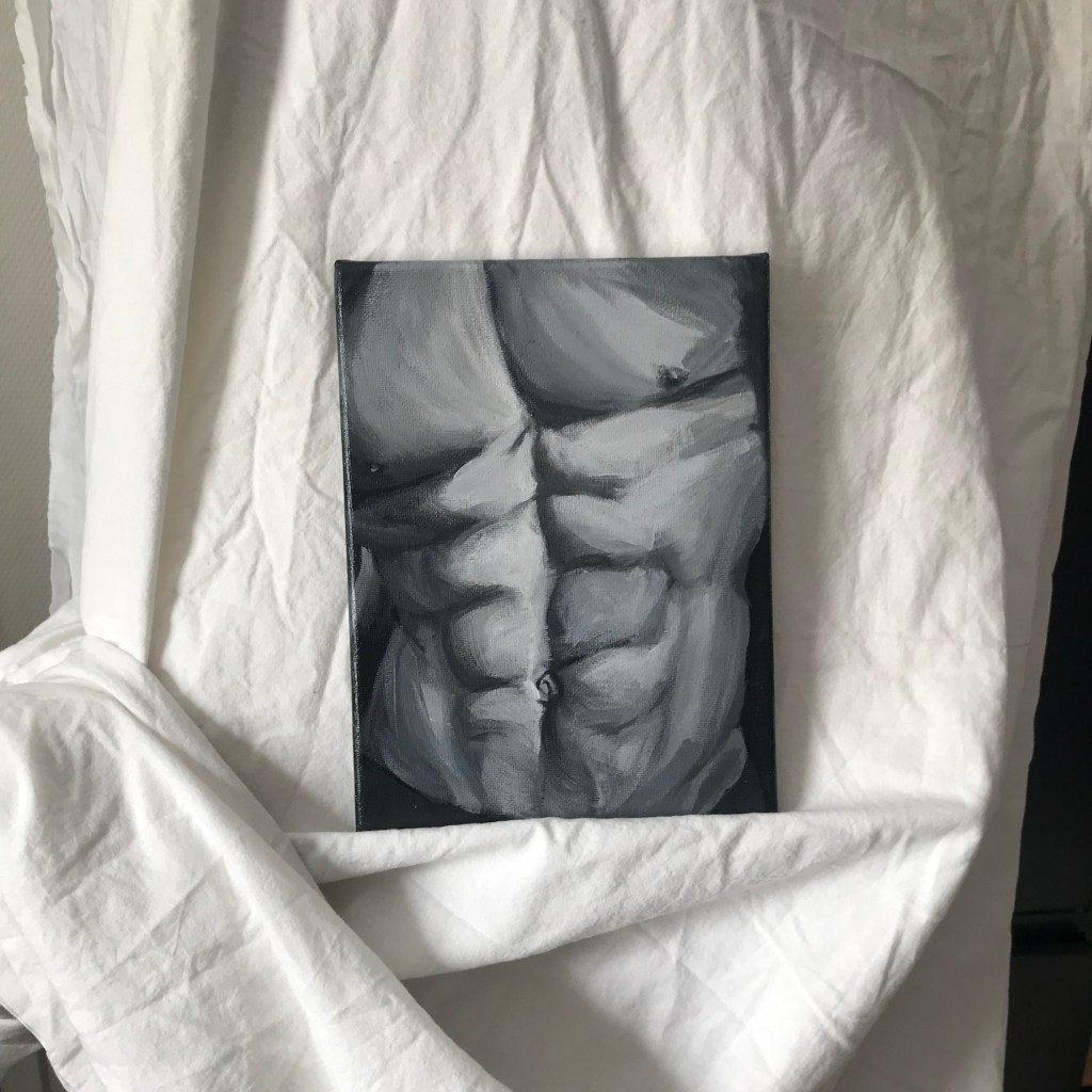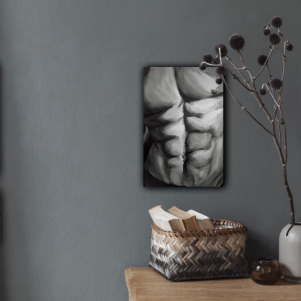 Mannelijk torso schilderij is met de hand geschilderd op katoenen gespannen canvas doek in vele tinten grijs. Het toont een deel van een naakt bovenlijf van een gespierde man met een behoorlijke sixpack.
