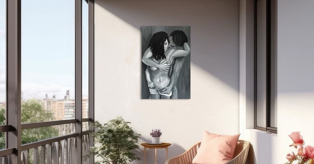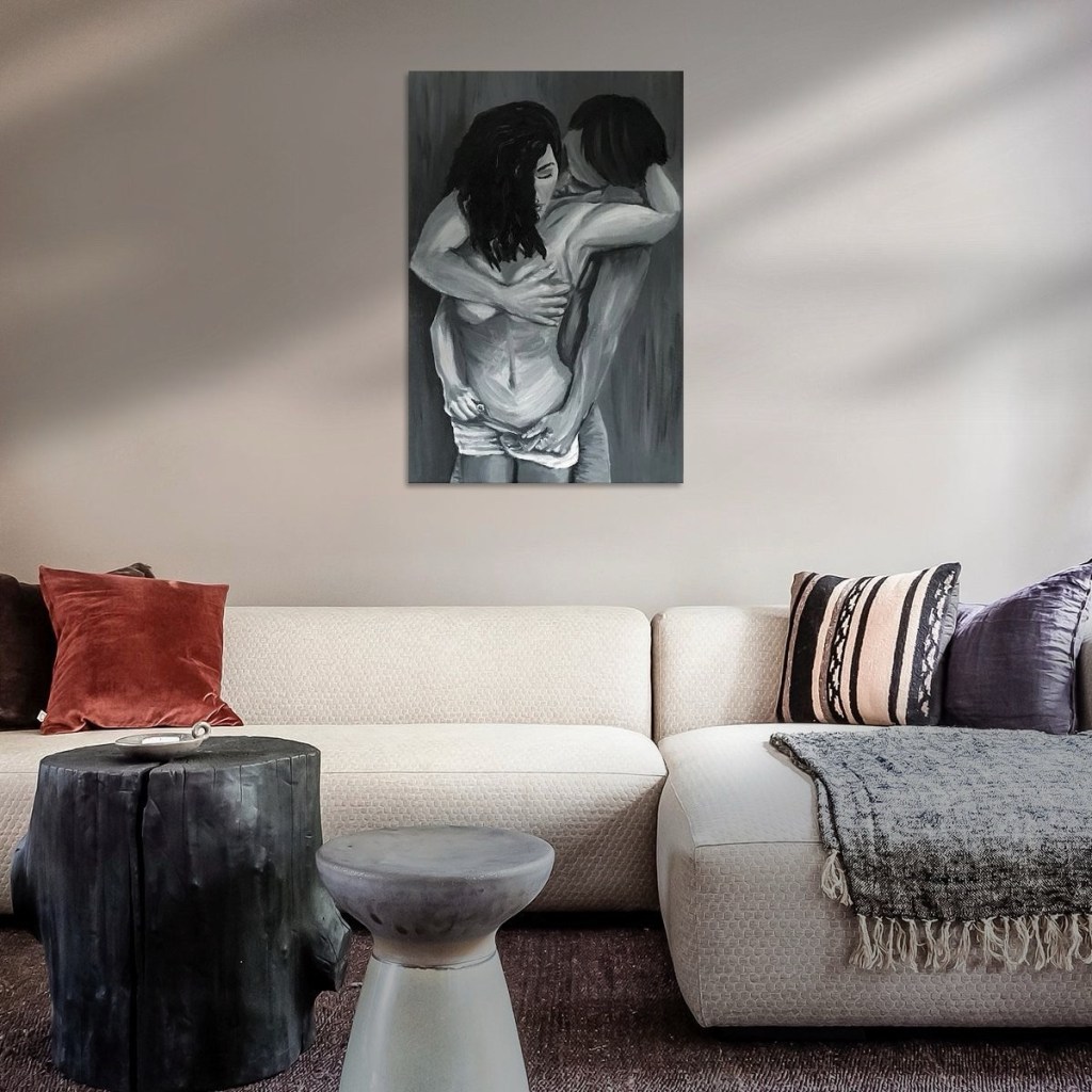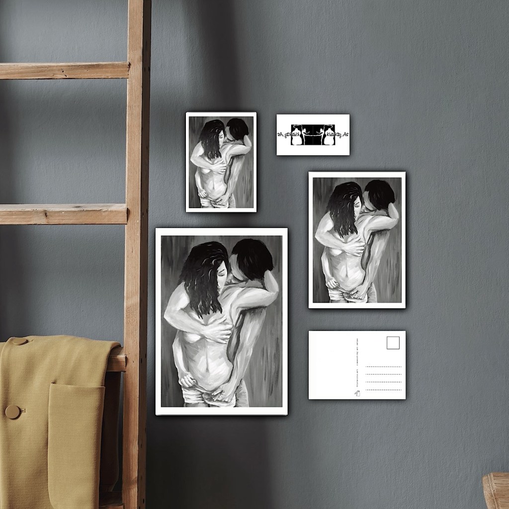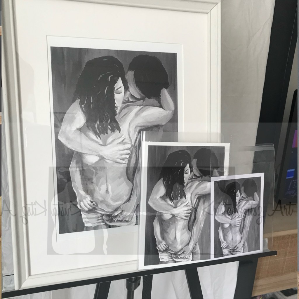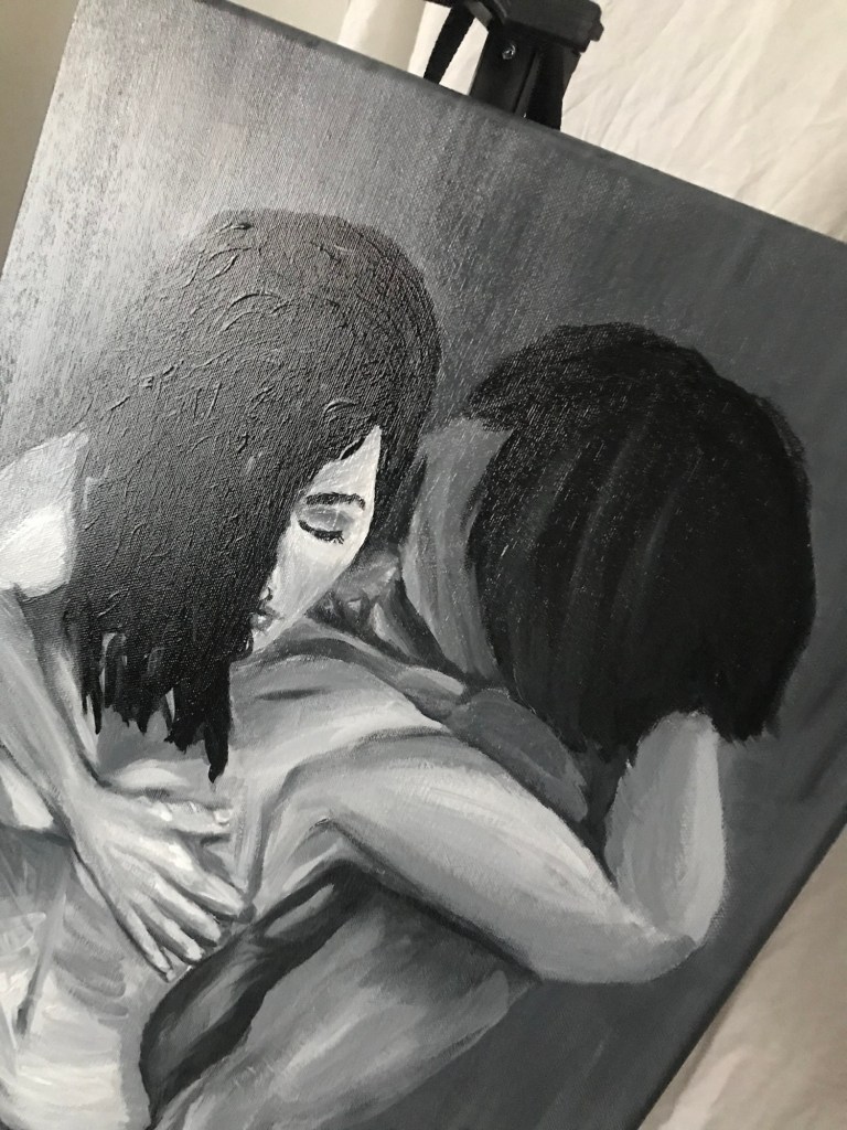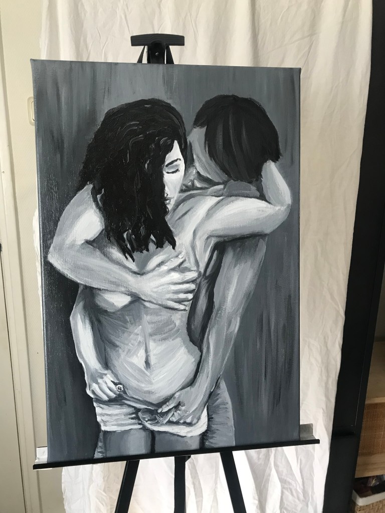 De serie die ik in deze stijl maak heet shades of grays. Figuratieve kunst geschilderd in grijstinten op katoenen doek of hout. De belichaming van het vrouwelijke en mannelijke figuur en ook de liefde.