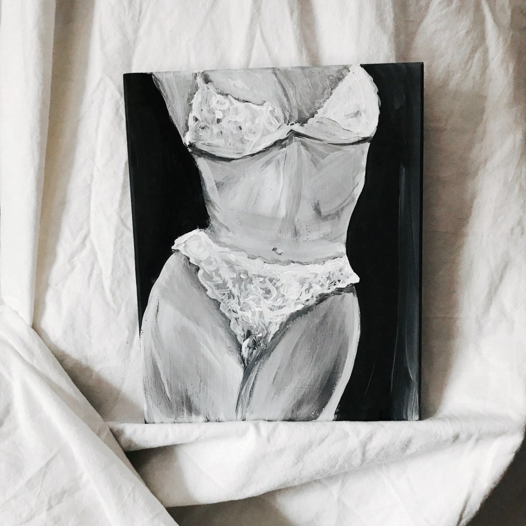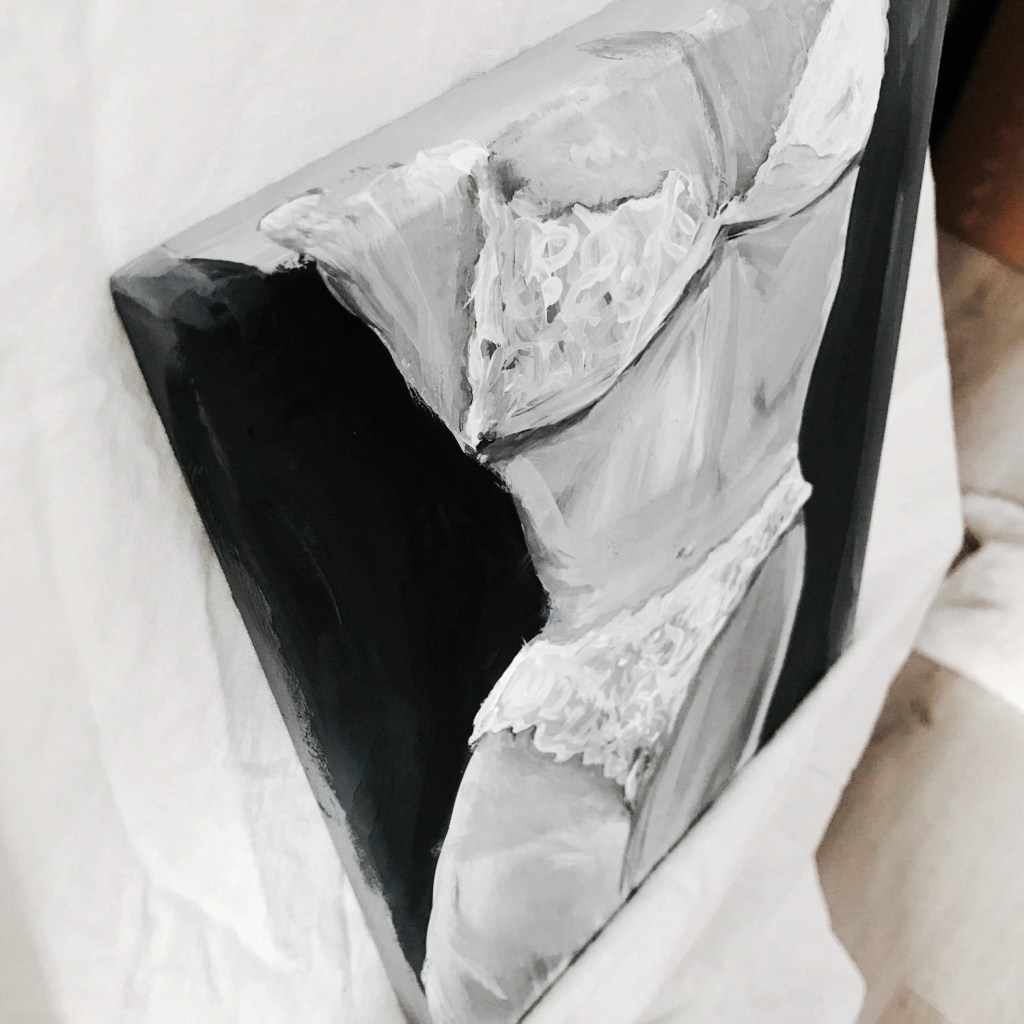 Vrouw in lingerie is met de hand geschilderd in vele tinten grijs. Het toont een deel van de mooie rondingen van een vrouwelijk figuur met een wit kanten lingerie set aan, en een deel van de bovenbenen.