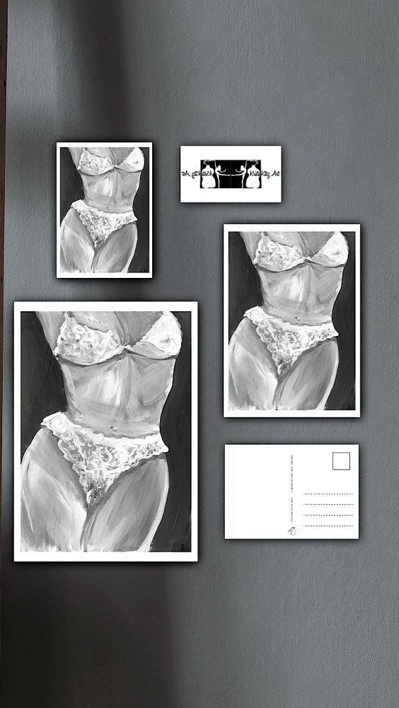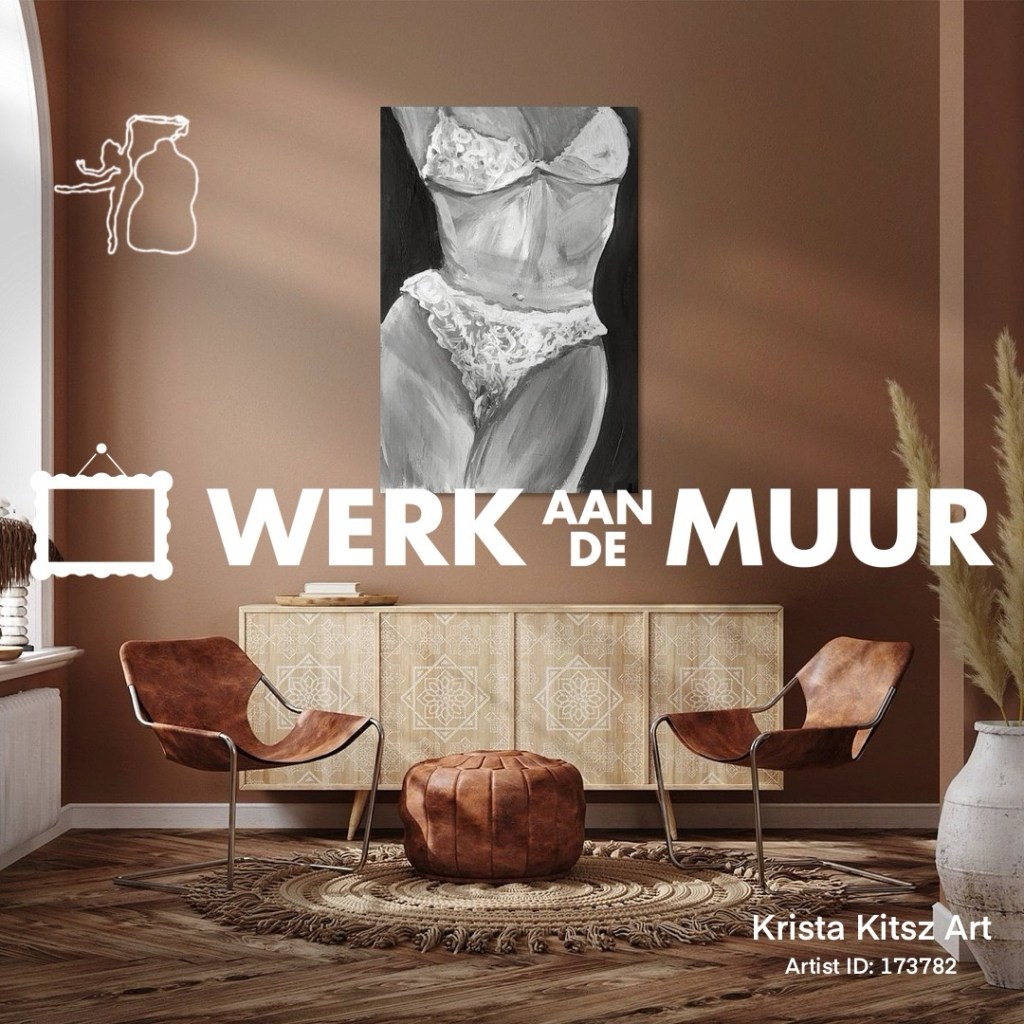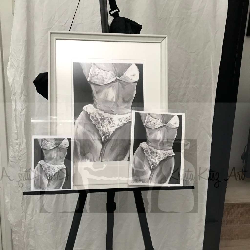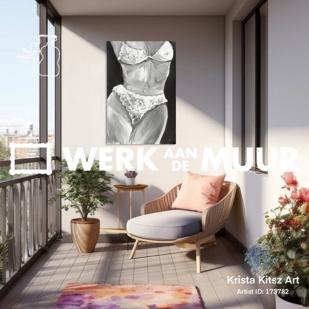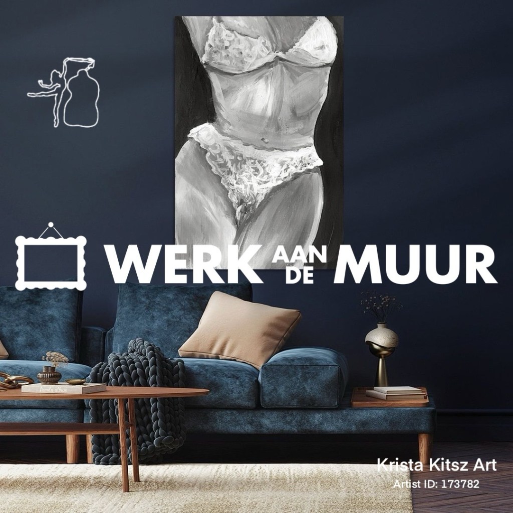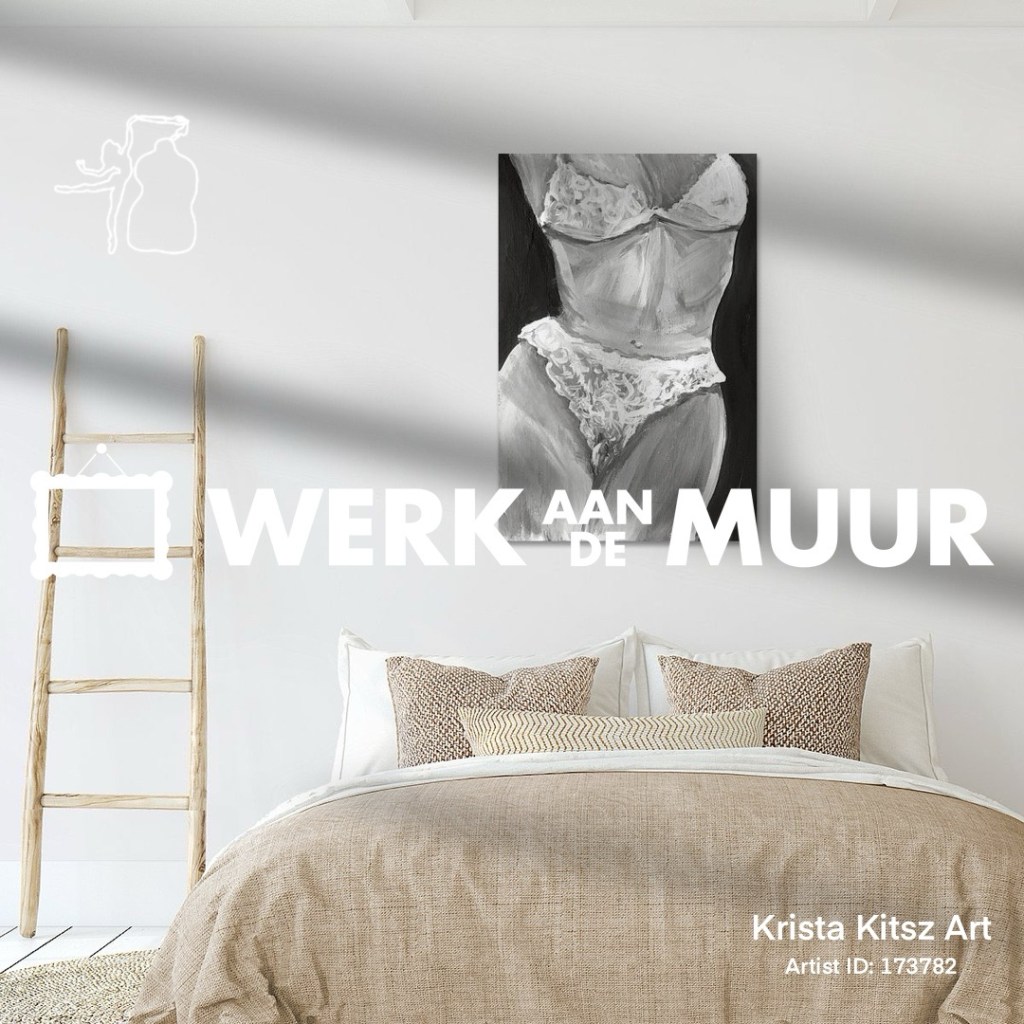 Koop dit schilderij Vrouw in lingerie schilderij grijstinten van Krista Kitsz Art als reproductie op canvas, aluminium dibond, (ingelijste) fotoprint, behang en ArtFrame, op maat geprint in Fine-Art kwaliteit.